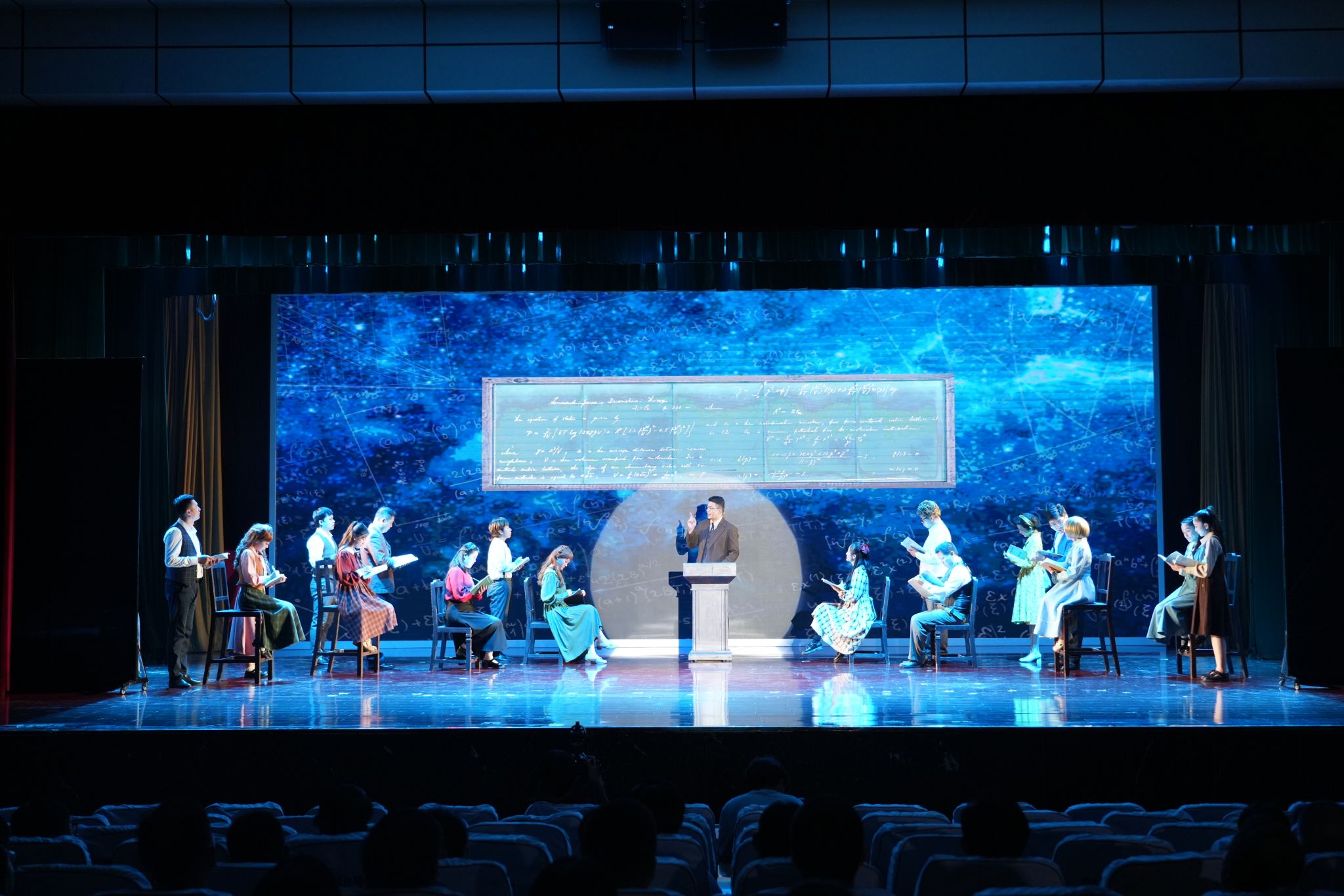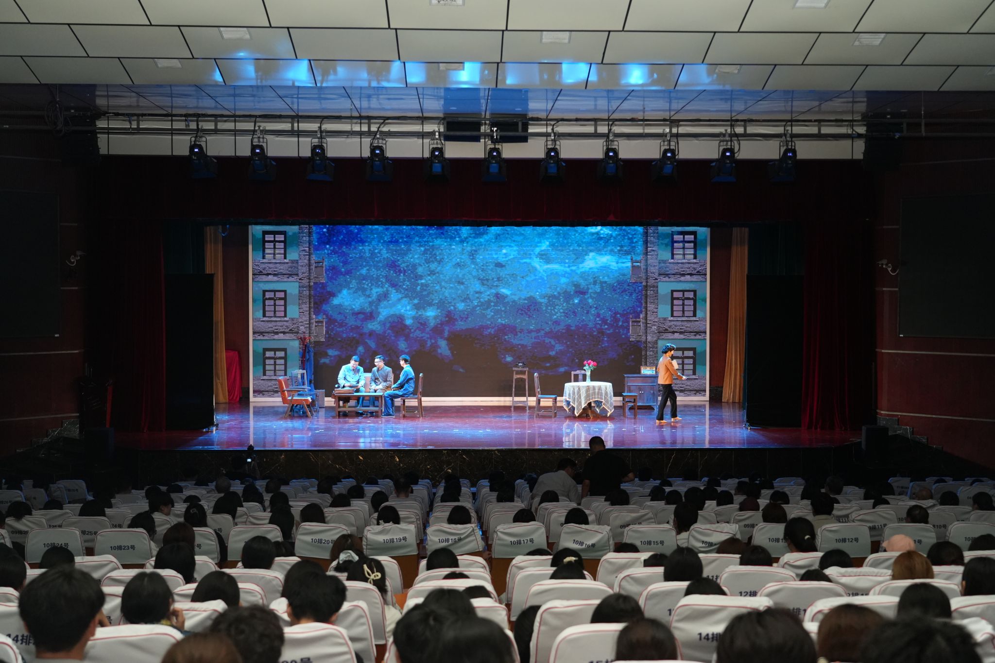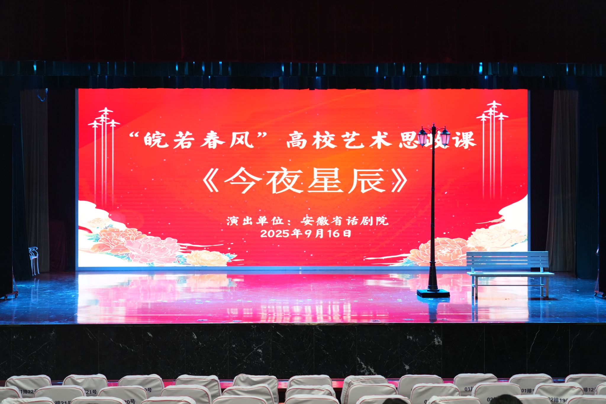 9月16日晚,我校文津校区大礼堂灯火通明,热烈的掌声持续不断。由中共安徽省委宣传部主办、安徽省话剧院创排的大型原创话剧《今夜星辰》作为“皖若春风”高校艺术思政课在这里隆重上演。来自皖南片的19所高校师生代表齐聚一堂,共同观看了这场感人至深、催人奋进的艺术演出。