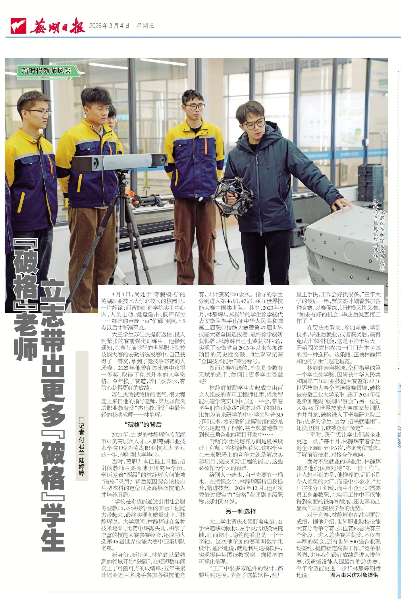 林静辉亲自挑选、全程指导的第一个学生徐学骏,因斩获中华人民共和国第二届职业技能大赛暨第47届世界技能大赛全国选拔赛银牌,破格被安徽工业大学录取,还于2024年受邀参加芜湖“畅聊早餐摇钱树国际(中国)官方网站”;另一位进入第46届世界技能大赛国家集训队的井肖龙,破格进入了奇瑞研究院工作;更多的学生,因为“招来就能用”,还没出校门,就被企业“预定”……